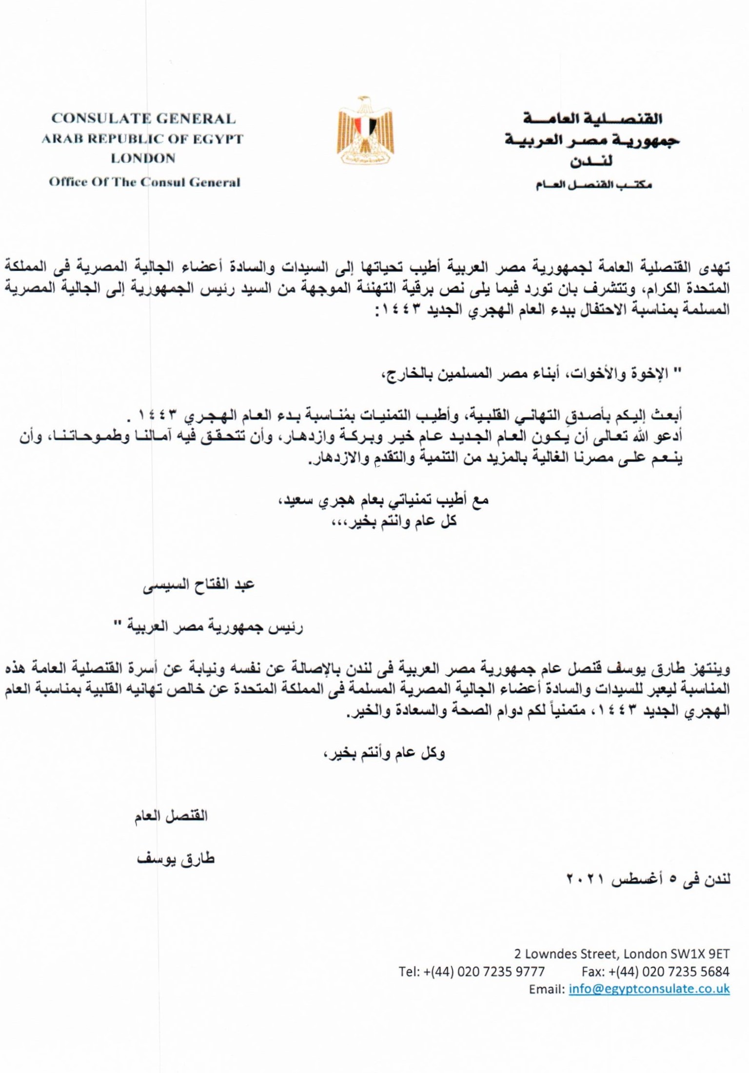 برقية التهنئة الموجهة من السيد رئيس الجمهورية إلى الجالية المصرية المسلمة بمناسبة الاحتفال ببدء العام الهجري الجديد 1443